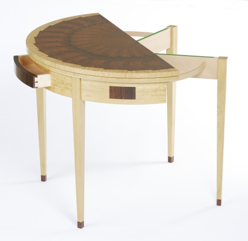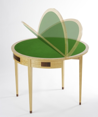 Card table in Satinwood and now very rare Rio Rosewood This flitch of rosewood veneers was some thirty years old and fell out into the fan or deck of cards pattern, thus dictating the nature of what had been planned as a simple demi-lune table. |