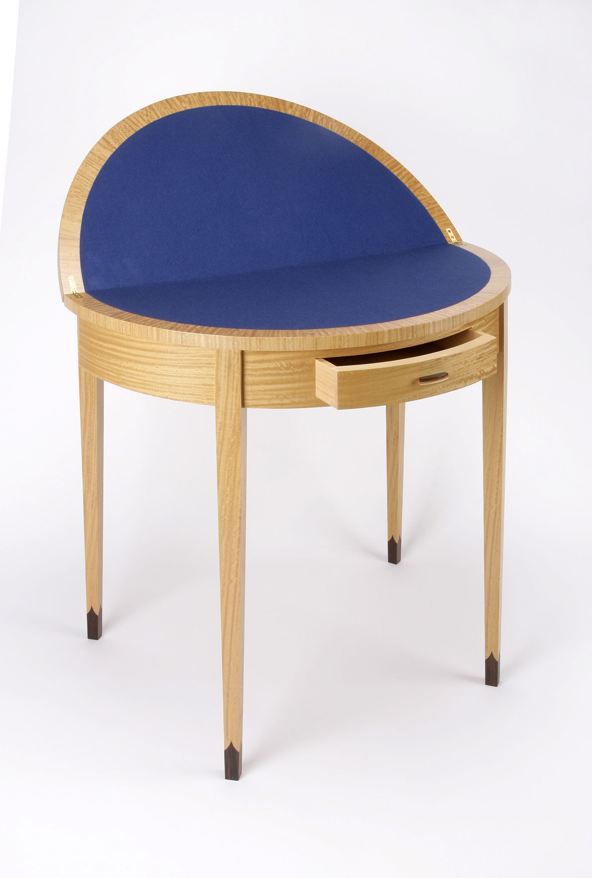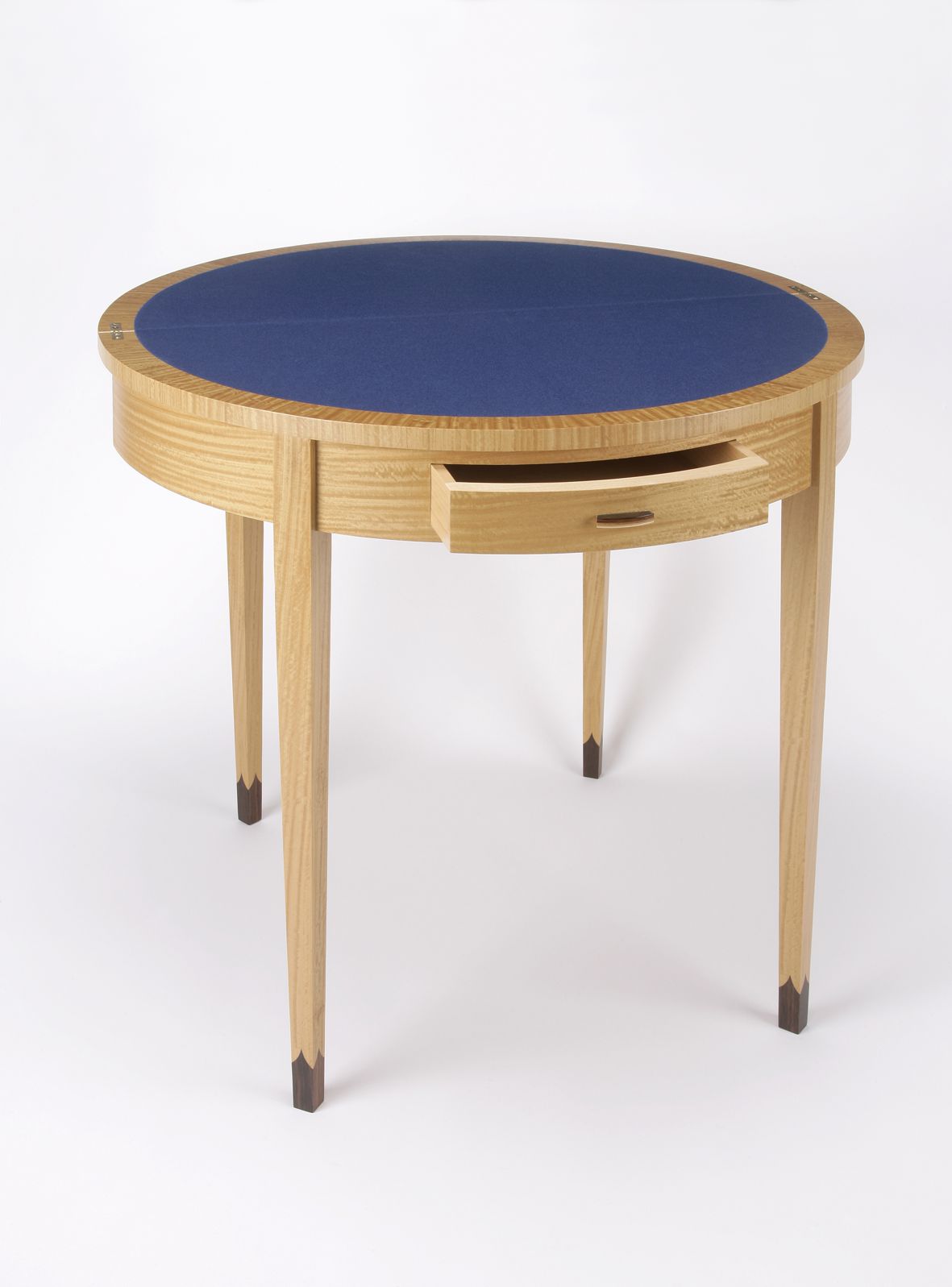 A fan of colour-graduated veneers set into a satinwood ground, the frame raised on rosewood sabots, with drawer for cards etc. Satinwood has a stunning beeswing figure and contrasts beautifully with the interior blue baize The inspiration for the arrangement of the graduated veneers came from producing an earlier card table, where on inspecting a pack of veneers the leaves were spread out suggesting a deck of cards, a particularly appropriate layout. Height 30" x width 36" x depth 18" |